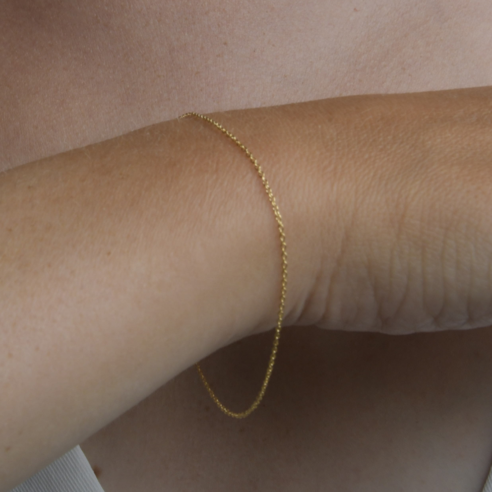 The Elle Bracelet is crafted from a 7-inch 14K gold-filled cable-link chain with a sleek 1.1mm width. Its clean lines and timeless design make it a go-to piece — whether worn solo for subtle elegance or stacked for a layered look.