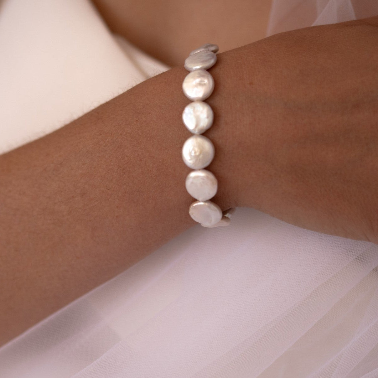 The Margo Bracelet features approximately 16 luminous 10mm AA-grade coin freshwater pearls, strung on a comfortable elasticated band and finished with a 14K gold-filled crimp bead. With its bold silhouette and radiant finish, Margo is a modern statement that doesn’t shout — effortlessly balancing presence with polish.